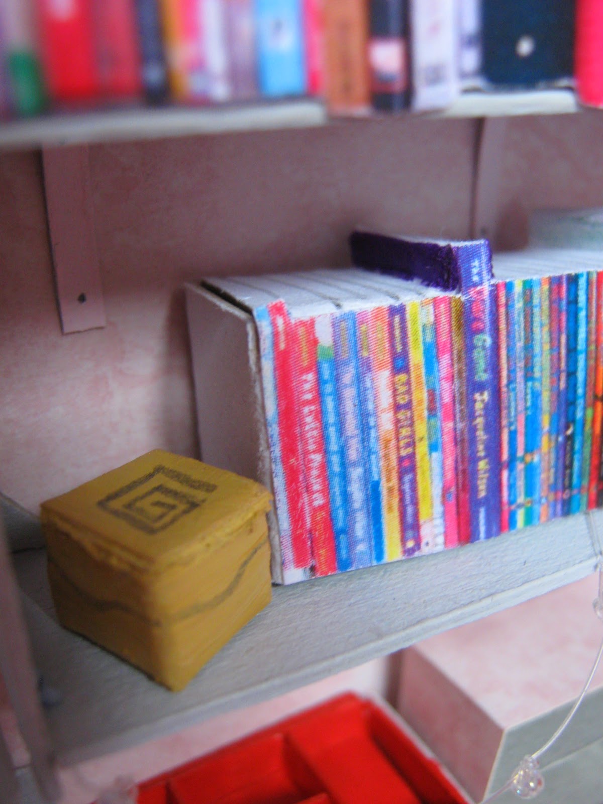 Here's a close up on the mini version of the wooden box I made in middle school, and some of my books. I made the books by taking a photo of the books on my shelf and sticking it to a little box made of card, slotting in more card for the taller books.